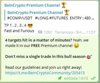 Dzięki kanałowi Premium na Telegramie społeczność czytelników BeInCrypto otrzymuje wysokiej jakości darmowe sygnały kryptowalutowe. Niezależnie, czy jesteś krótkoterminowym traderem i szukasz szybkiego zysku, czy długoterminowym inwestorem, który spogląda miesiące i lata w przód, darmowy kanał Premium jest dla Ciebie!
