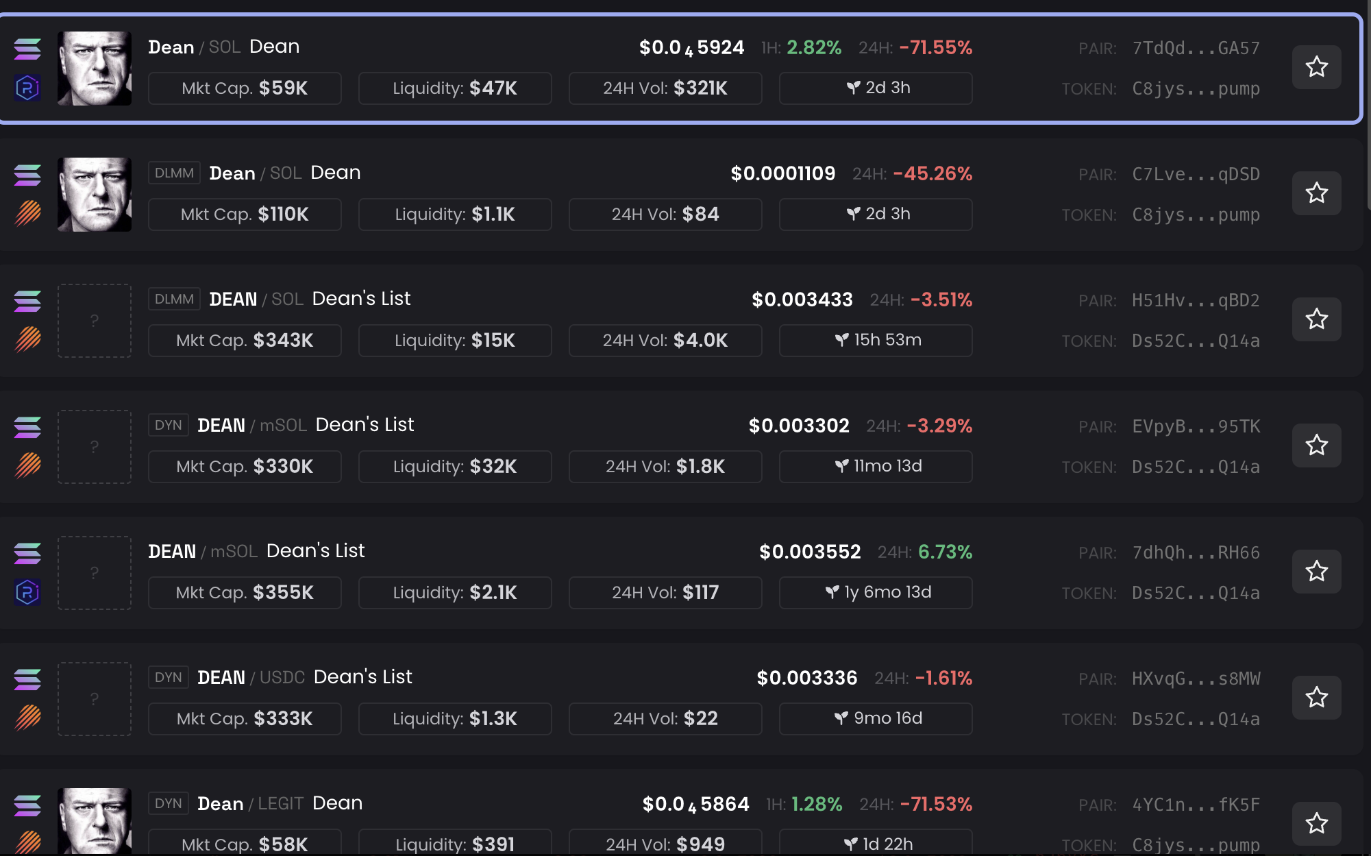 W momencie raportowania, kilka memecoinów DEAN – niektóre mające zaledwie dzień lub dwa – pozostawało dostępnych do handlu na rynku.
