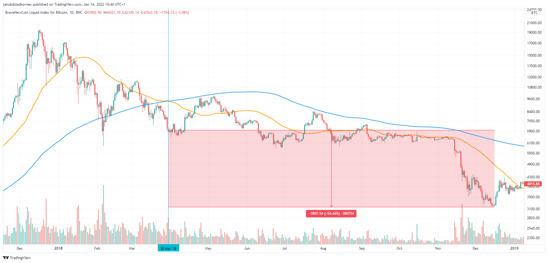 Po kolejnej hossie z lat 2016-2017 i historycznym ATH na poziomie 19 764 USD death cross wydarzył się w dniu 30 marca 2018 roku. Bezpośrednio po tym sygnale Bitcoin wzrósł o 42%. Jednak ostatecznie spadał przez kolejne 9 miesięcy, osiągając dołek na 3148 USD w dniu 15 grudnia 2018 roku. Mierząc od przecięcia 50 MA poniżej 200 MA był to 55% spadek.