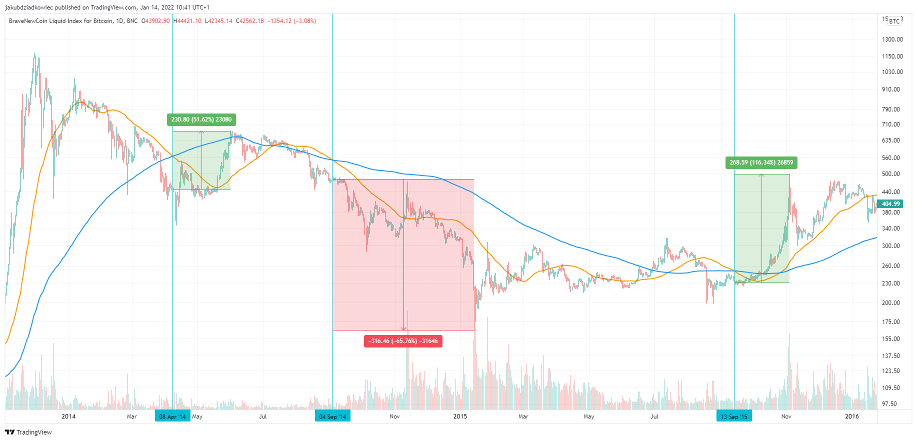 Kolejne 3 przypadki death cross miały miejsce po hossie z lat 2012-2013. Niedźwiedzie sygnały pojawiły się po tym, jak Bitcoin ustanowił szczyt na 1177 USD w dniu 30 listopada 2013 roku. Co ciekawe, z tylko jeden z tych sygnałów doprowadził do gwałtownych spadków i osiągnięcia dna rynku niedźwiedzia. Kolejne przypadki death cross miały miejsce: