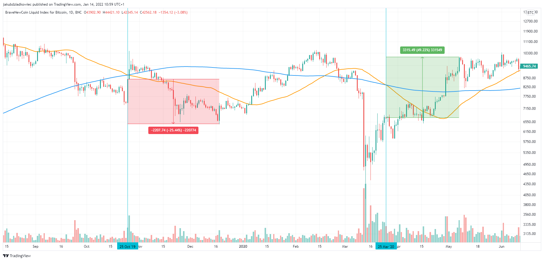 Death cross miał wówczas miejsce miesiąc przed zakończeniem korekty. Bezpośrednio po nim cena BTC co prawda spadła o kolejne 18%, lecz ostatecznie odbiła się i wzrosła o 49% przed kolejnym golden cross, o którym pisaliśmy w poprzedniej sekcji.