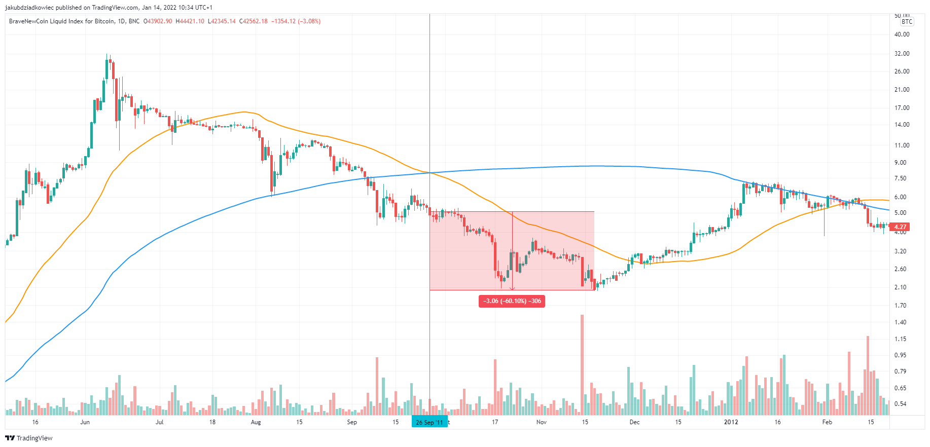 Pierwszy death cross wydarzył się podczas cyklu genesis Bitcoina w dniu 28 września 2011 roku. Wówczas BTC spadał po osiągnięciu szczytu na 31,90 USD. Od przecięcia 50 MA poniżej 200 MA Bitcoin stracił kolejne 60%. Odnotował makro dołek na 2,01 USD w dniu 18 listopada 2011 roku. Nigdy później nie wrócił już do tej ceny.