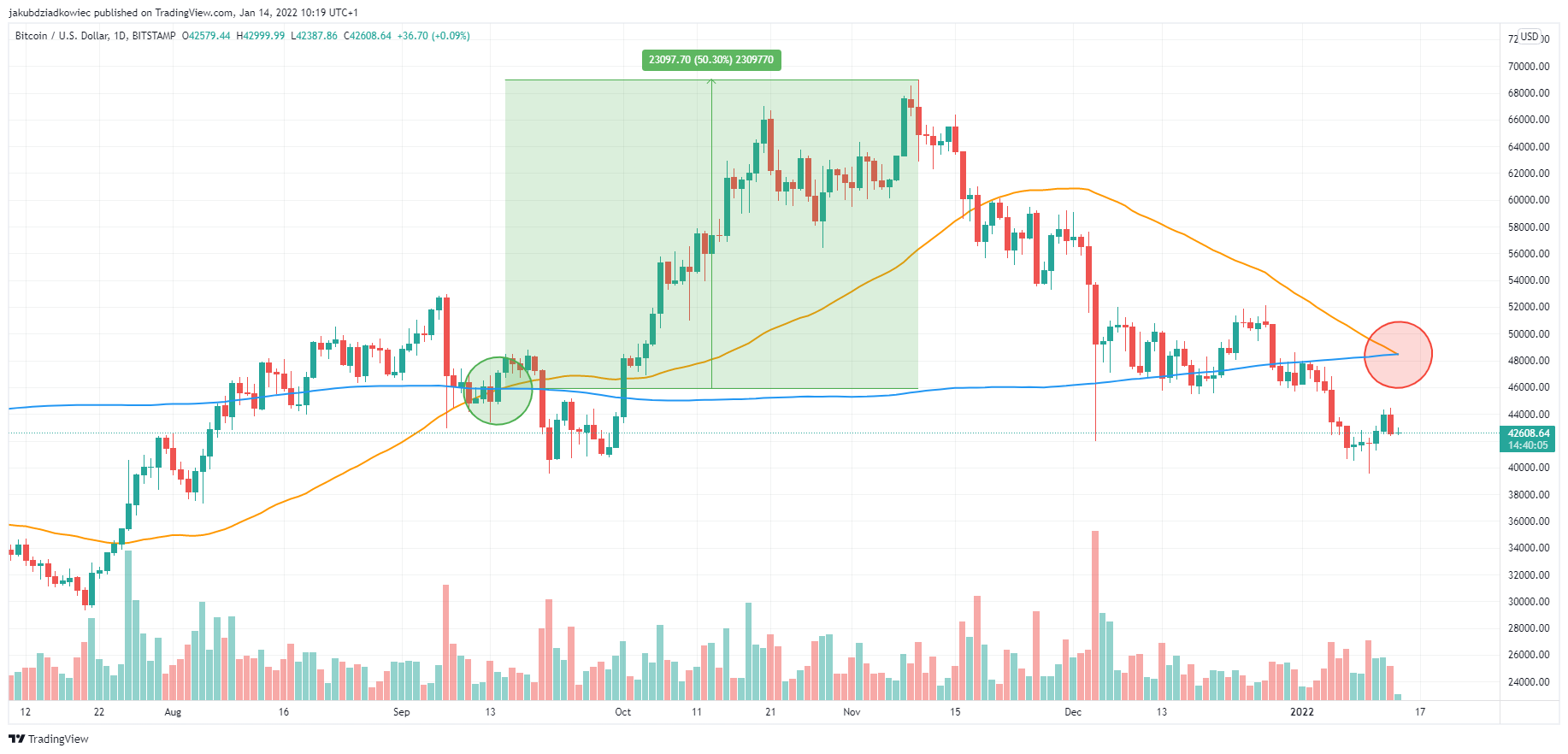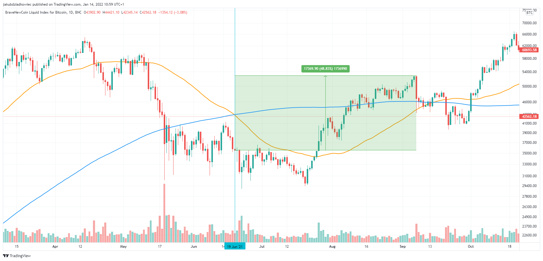 W dniu 15 września 2021 roku byliśmy świadkami golden cross na wykresie BTC. Jego pojawienie się było konsekwencją dynamicznego wzrostu cen Bitcoina po osiągnięciu dołka na 29 500 USD w dniu 21 lipca 2021 roku. Mierząc od tego wydarzenia do ATH największa kryptowaluta zyskała 50%. Stało się tak pomimo początkowego spadku o 14% i odnotowaniu dołka na 39 500 USD.