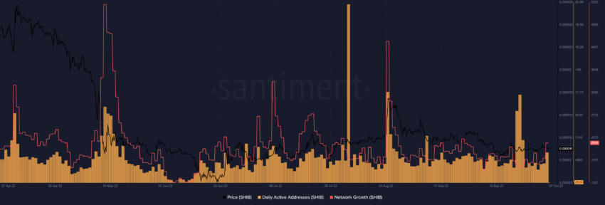 Shiba Inu, główny Dogecoin killer, był kolejnym czołowym altcoinem, który powolny i stale zmagał się w ostatnim kwartale. Chociaż spadł o 87,23% od swojego ATH, jego dzienne aktywne adresy i wzrost sieci utrzymywały się na stałym poziomie przez ostatnie kilka miesięcy. Wyjątkiem pozostaje kilka spadków.