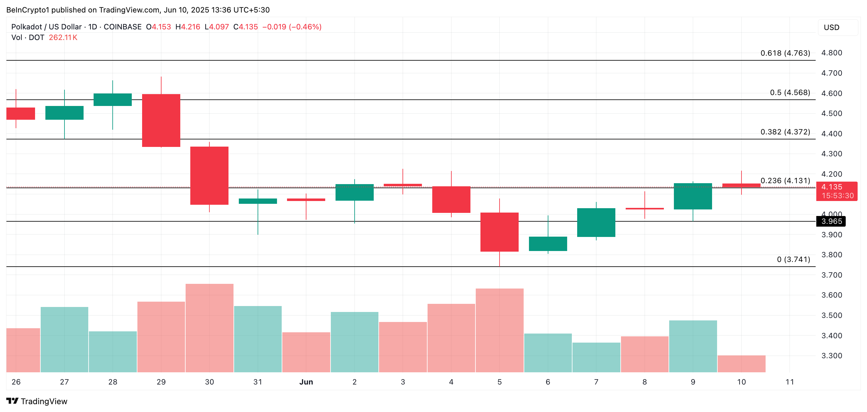Jednak niekorzystna decyzja SEC jutro mogłaby zachwiać zaufaniem inwestorów i wywołać wyprzedaże. To mogłoby obniżyć cenę DOT w kierunku poziomu 3,96 USD.