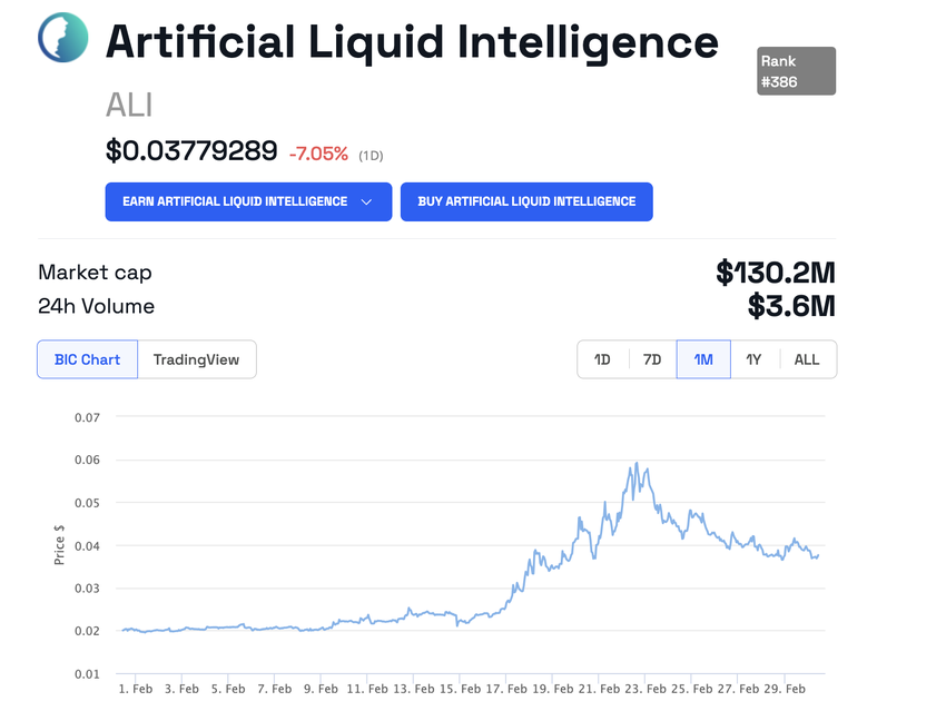 Pomimo proaktywnych działań ze strony społeczności, cena tokena Artificial Liquid Intelligence jeszcze się nie podniosła. W chwili pisania tego tekstu ALI kosztuje 0,03 USD, co oznacza spadek o około 7% w ciągu ostatnich 24 godzin.
