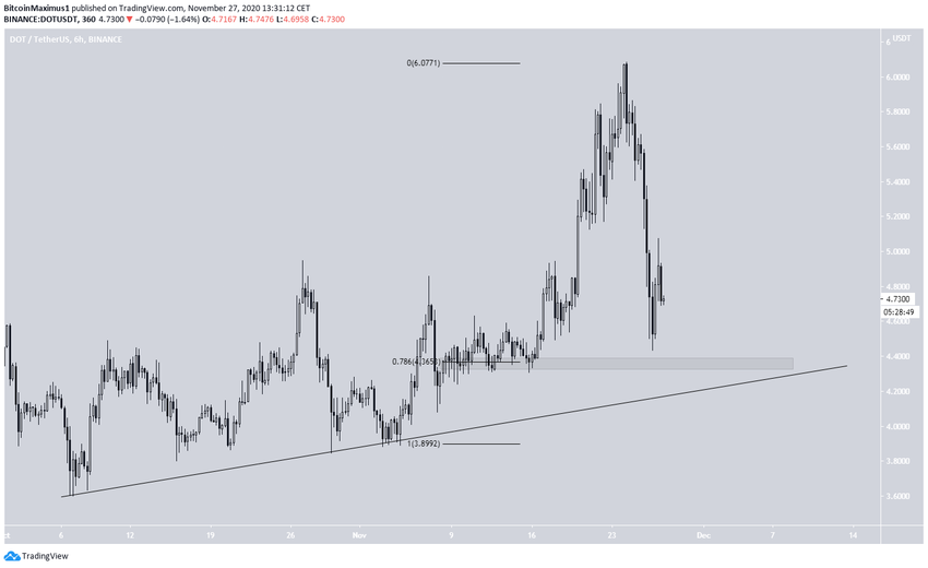 Podobnie jak DIA, DOT podąża za rosnącą linią wsparcia i prawie już ją potwierdził za pomocą długiego dolnego knota.