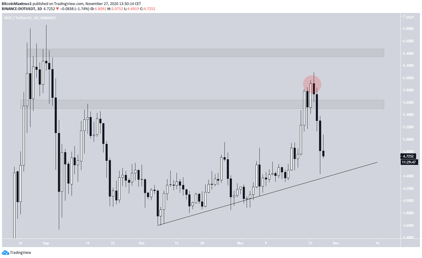 W przeciwieństwie do DIA, cena DOT przekroczyła główny obszar oporu, który wynosi 5,60 USD. Jednak wybicie okazało się tylko odchyleniem, ponieważ cena wkrótce spadła poniżej tego poziomu.