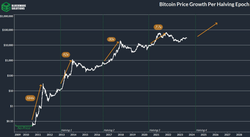 Ponieważ zbliża się kolejny halving Bitcoina w 2024 r., spekulacje są powszechne, a różni eksperci branżowi dzielą się swoimi prognozami. Jeden z powszechnych sentymentów odzwierciedla prognozę, że Bitcoin osiągnie poziom 100 000 USD przed tym kamieniem milowym.