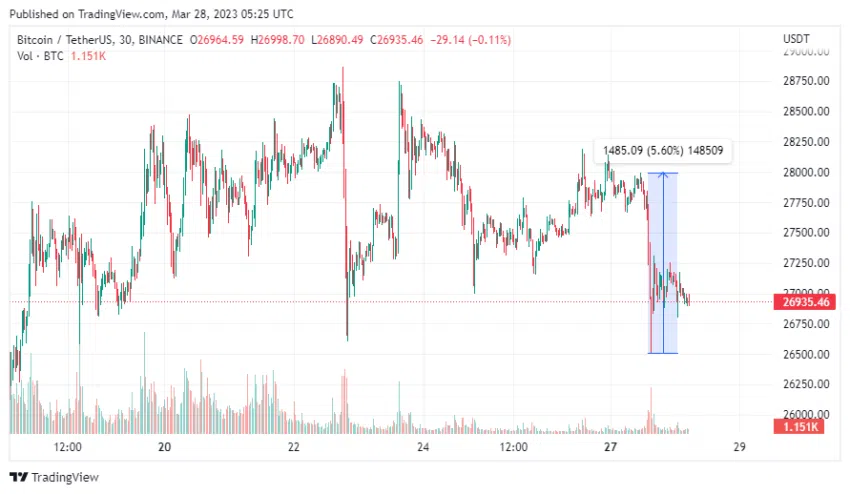 W tym czasie Bitcoin stracił ponad 5% swojej wartości. Według CoinMarketCap, BTC odnowił wtedy swoje lokalne minimum na poziomie 26 606 dolarów. W chwili pisania tego tekstu moneta skorygowała się do 26 935 dolarów.