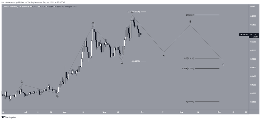 Jeśli korekta się rozpoczęła, CHZ znajduje się obecnie w fali A struktury ABC. Cała korekta może zakończyć się między poziomami wsparcia zniesienia 0,5-0,618 Fib na poziomie 0,158-0,181 USD.
