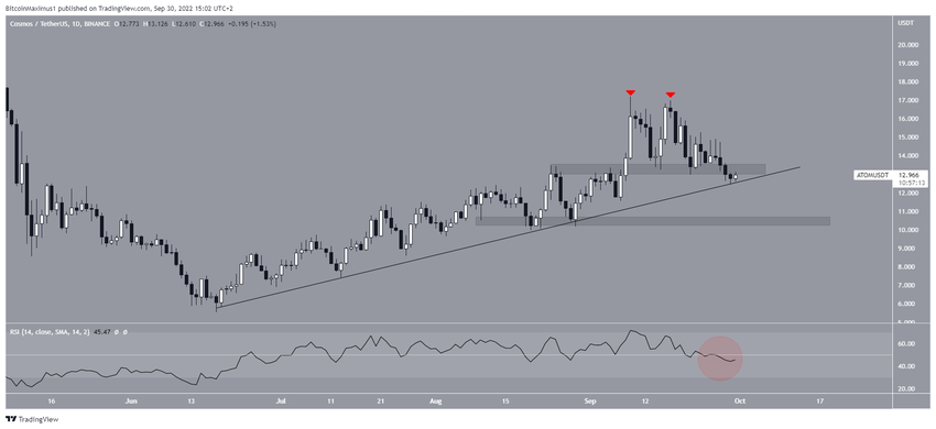 ATOM spada od czasu stworzenia wzoru podwójnego szczytu (czerwone ikony) 9 i 17 września. Ruch w dół spowodował załamanie z poziomego obszaru wsparcia 13,50 USD. To doprowadziło ATOM do rosnącej linii wsparcia, która istnieje od czerwcowych minimów.