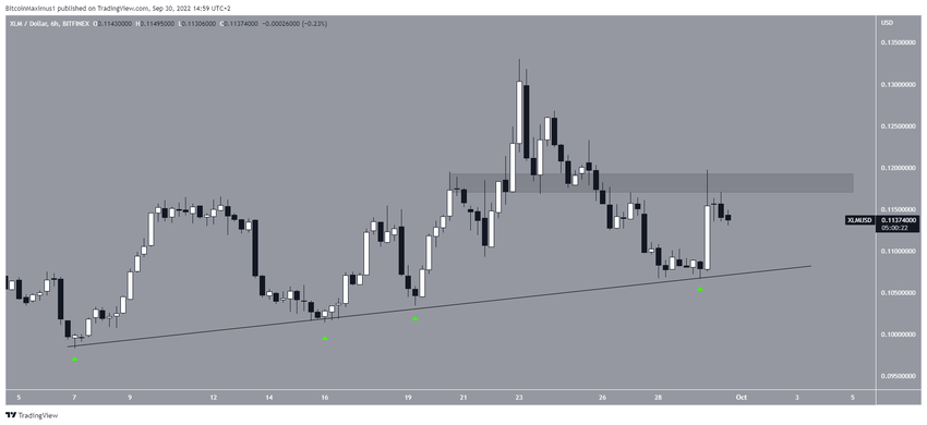 XLM rośnie wraz z rosnącą linią wsparcia od 6 września. Do tej pory linię potwierdzono czterokrotnie (zielone ikony), ostatnio 22 września. XLM zainicjował później ruch w górę, ale nie zdołał przekroczyć oporu 0,118 USD.
