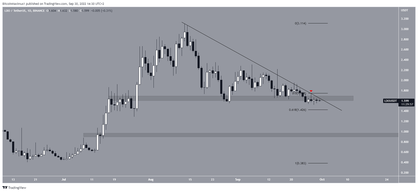 LDO spada poniżej opadającej linii oporu, odkąd 13 sierpnia osiągnęło szczyt 3,10 USD. Ruch w dół spowodował, że LDO spadło do poziomego wsparcia 1,60 USD.