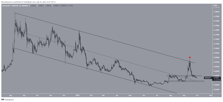 RVN spada, odkąd został odrzucony przez linię oporu, długoterminowego kanału równoległego opadającego, 14 września (czerwona ikona). Ruch w dół doprowadził do tej pory do minimum 0,034 USD, które zostało osiągnięte 28 września.