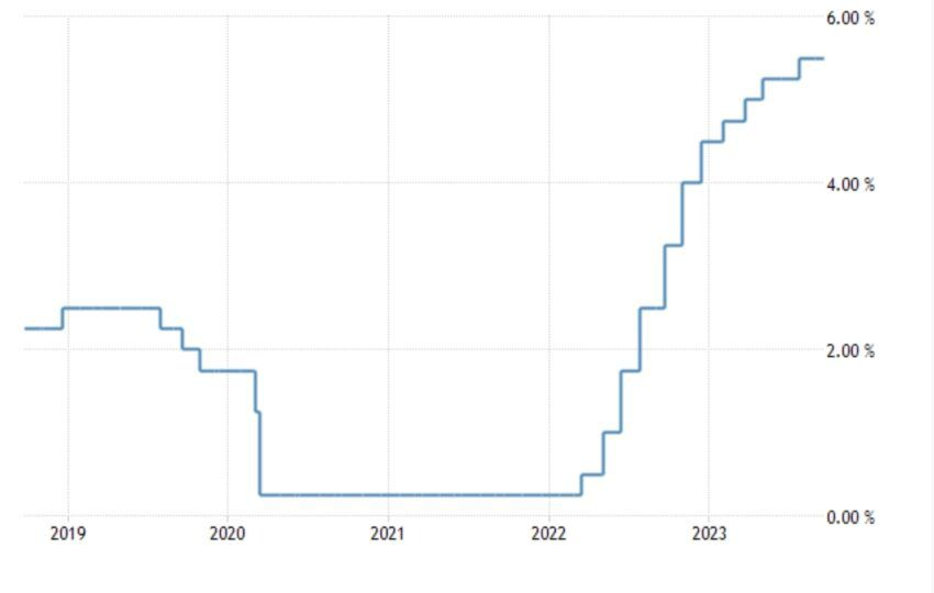 Rezerwa Federalna Stanów Zjednoczonych może obniżyć kluczową stopę procentową. W 2022 r., w kontekście eskalacji konfliktu na arenie geopolitycznej i przyspieszającej inflacji, regulator rozpoczął cykl podwyżek stóp procentowych. Ich wzrost zmniejsza atrakcyjność ryzykownych aktywów, takich jak kryptowaluty. Ponadto wysoka stopa procentowa wywiera presję na rynek akcji, z którym koreluje Bitcoin.