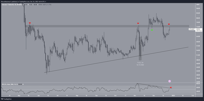 Cena Litecoin (LTC) podjęła próbę wybicia z obszaru oporu 72,50 USD 26 grudnia, ale została odrzucona. Ze względu na zbieżność wielu poziomów oporu, jest to obszar kluczowy dla przyszłego trendu.