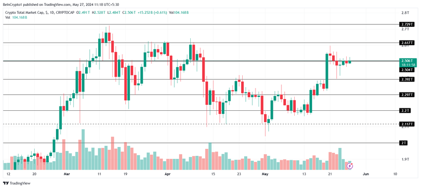 Całkowita kapitalizacja rynkowa kryptowalut (TOTAL) i cena Bitcoina (BTC) są obecnie stonowane ze względu na niedźwiedzie warunki makro. Niedawne zatwierdzenie zgłoszeń spot Ethereum i ustawy o ramach regulacyjnych kryptowalut FIT21 nie miały jeszcze pozytywnego wpływu na rynek.