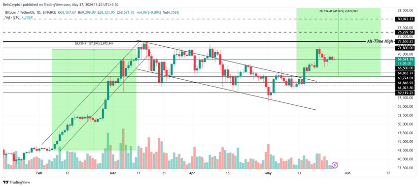 W chwili pisania tego tekstu cena Bitcoina wynosi 68 571 USD po tym, jak nie udało się przełamać oporu na poziomie 71 800 USD. Utrzymanie wsparcia na poziomie 70 000 USD lub odbicie się od niego umożliwiłoby BTC dalszy wzrost, ale tak się nie stało.