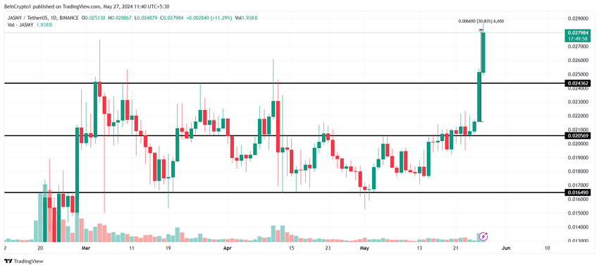JASMY odnotował 30% wzrost, dzięki czemu aktywa kryptowalutowe wzrosły z 0,021 USD do 0,027 USD i w rezultacie osiągnęły dwuletni szczyt.
