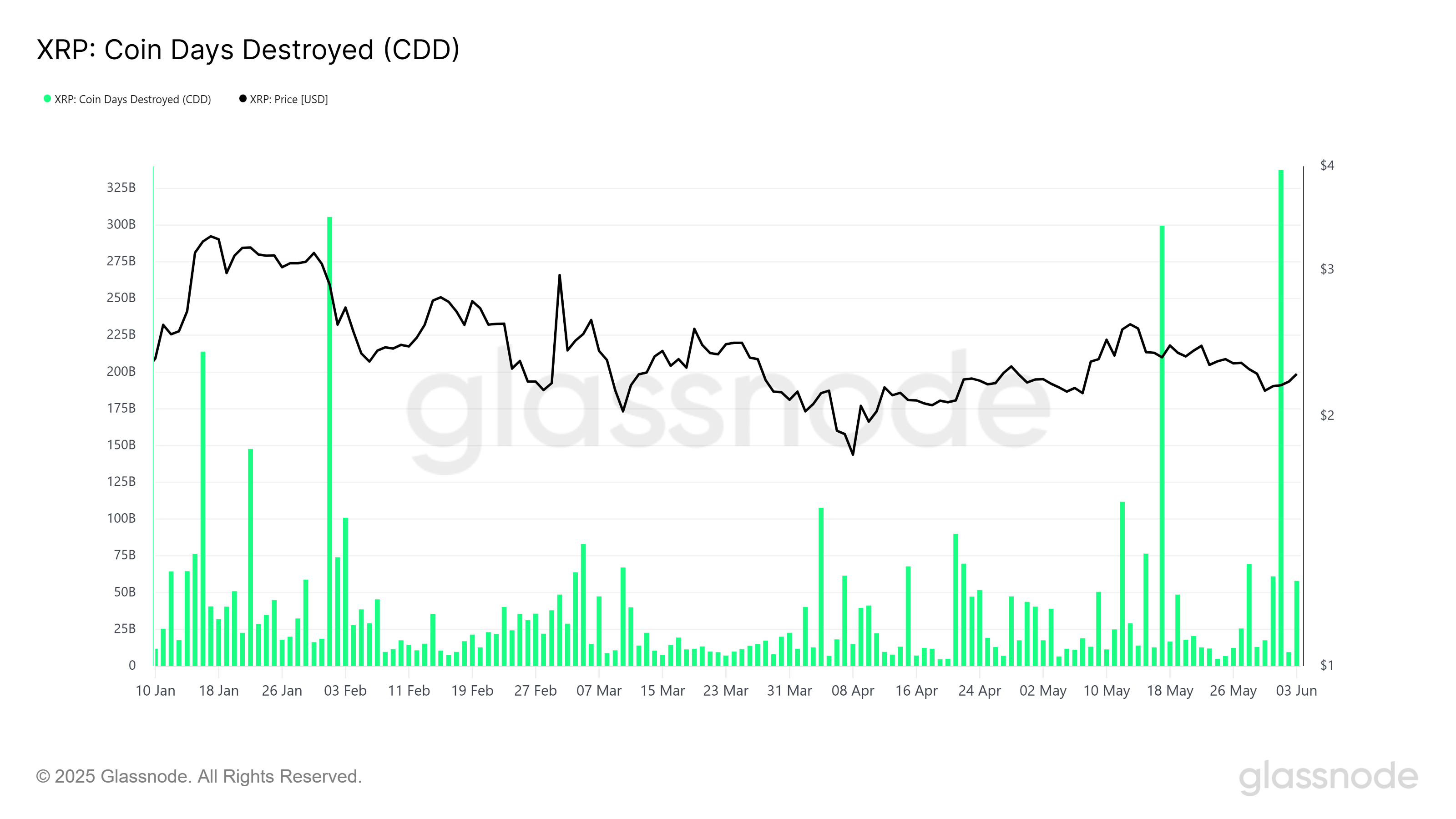 Jednak szerszy makroekonomiczny trend XRP ujawnia pewne ostrzegawcze sygnały. Wskaźnik Coin Days Destroyed (CDD) niedawno osiągnął najwyższy poziom od stycznia tego roku. Metryka CDD mierzy liczbę monet posiadanych przez LTH pomnożoną przez liczbę dni, przez które były trzymane przed sprzedażą, skutecznie niszcząc zgromadzone dni.