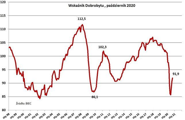 Ważną składową wskaźnika dobrobytu jest rosnące zatrudnienie w przedsiębiorstwach i mniejszych firmach. Obserwujemy stały przyrost zatrudnienia względem drastycznej redukcji w wyniku wiosennego kryzysu COVID-19. Aktualnie poziom zatrudnienia zbliżył się do tego sprzed pandemii, ale wciąż jest o 1,2% niższy niż przed rokiem.