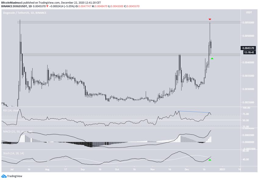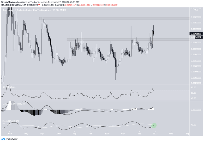 Wykres tygodniowy pokazuje, że DOGE porusza się w górę od marca. Chociaż początkowo walczył z przekroczeniem obszaru oporu na 0,0035 USD, to z powodzeniem wybił się powyżej w ciągu tygodnia pomiędzy 14-21 grudnia. Osiągnął również najwyższe tygodniowe zamknięcie od października 2018 r.