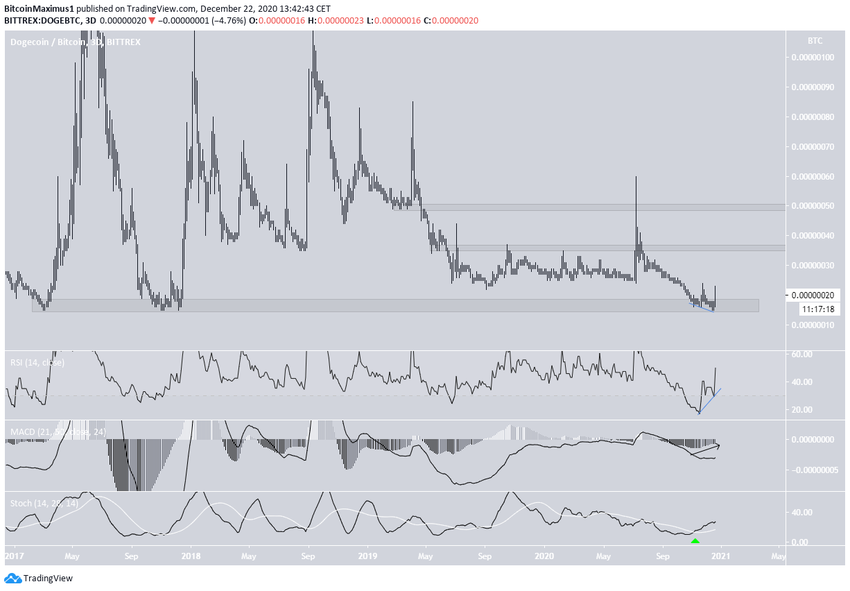 Wsparcie wynosi 17 satoshi i utrzymuje się od początku 2017 r. DOGE był notowany w tym zakresie przez ostatnie dwa miesiące, tworząc znaczną zwyżkową dywergencję aż do trzydniowego RSI.