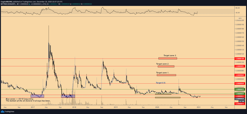 Kryptowalutowy trader @CryptoMichNL przedstawił wykres DOGE/BTC, stwierdzając, że osiągnął kluczowy poziom wsparcia, z którego prawdopodobne jest odbicie.