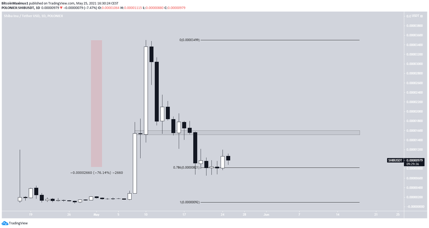 SHIB osiągnął ATH na poziomie 0,000035 USD w dniu 10 maja. Jednak od tego czasu znacznie spadł, aż do poziomu zniesienia 0,786 Fib o wartości 0,0000082 USD. Ruch w dół wyniósł 76%.