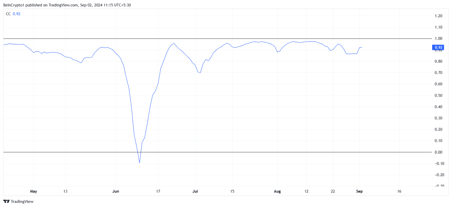 Obecna korelacja między Bitcoinem a Dogecoinem jest niezwykle silna. Wynosi bowiem na ten moment aż 0,92 pkt, co oznacza, że ruchy cenowe tych dwóch kryptowalut są niemal identyczne. W praktyce oznacza to, że gdy Bitcoin rośnie, Dogecoin również ma tendencję do wzrostu. Jednak to zależność działa także w drugą stronę – spadki na rynku Bitcoina często skutkują również spadkami Dogecoina.