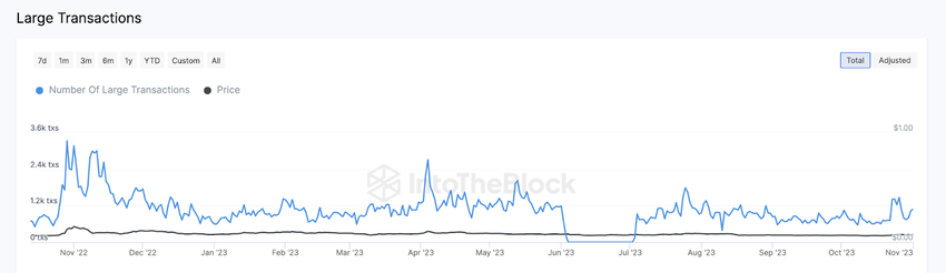 Co ciekawe, podobny trend pojawił się również przed DOGE Day w 2023 roku. W okresie od 24 października do 1 listopada liczba dużych transakcji wzrosła z 790 do 1090.