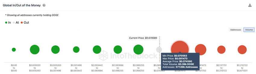 Jak pokazano poniżej, 577 890 adresów kupiło 60,39 mld DOGE po maksymalnej cenie 0,081 USD. Jeśli wcześniej wyjdą ze swoich pozycji, może to spowodować natychmiastową korektę ceny Dogecoin.