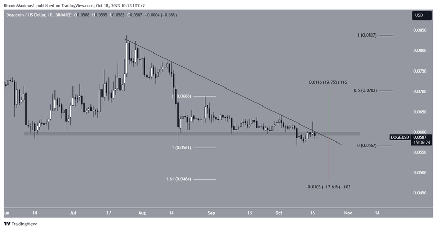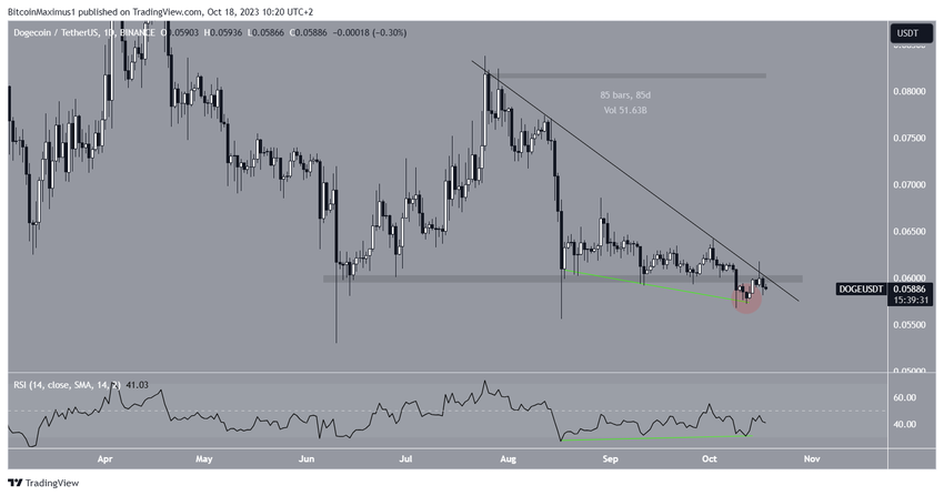 DOGE znajduje się obecnie w obszarze horyznotalnym przy 0,060 USD i spadkowej linii trendu oporu. Do tej pory linia ta obowiązywała przez 85 dni.