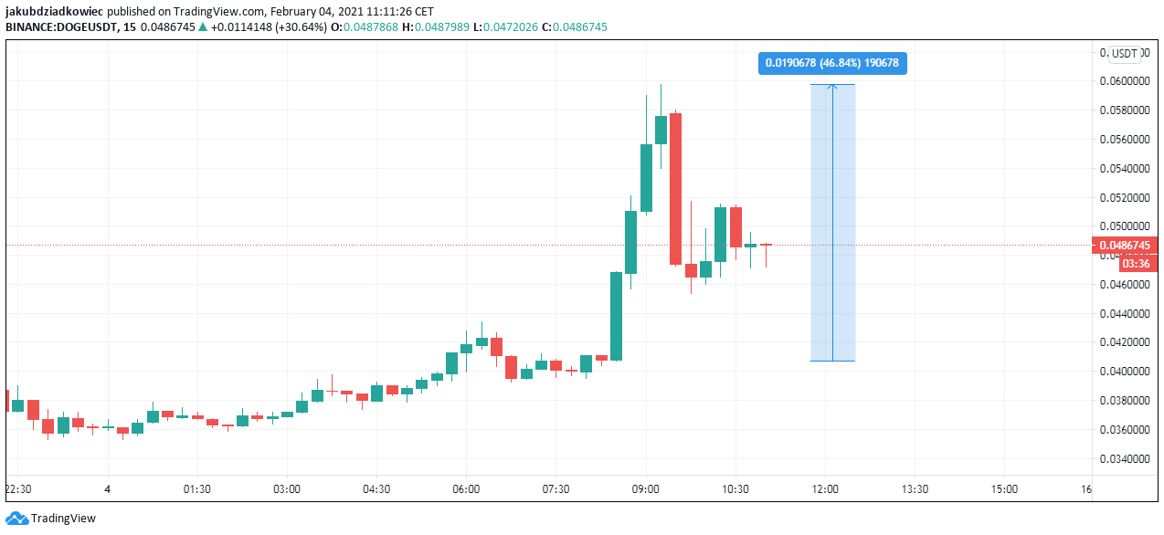 Reakcja rynku na tego żartobliwego tweeta była natychmiastowa. Akcja cenowa momentalnie przyspieszyła, gwałtownie wybijając się z poziomu 0,04 USD i w niecałą godzinę osiągając lokalny szczyt na 0,06 USD. Wartość DOGE wzrosła o 50%.
