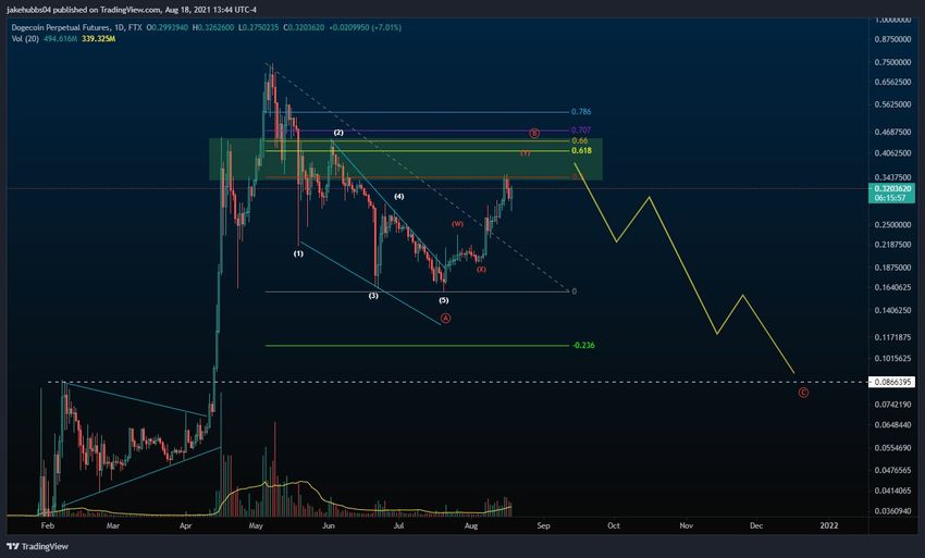 Jest prawdopodobne, że DOGE znajduje się w strukturze korekcyjnej. Osiągnięcie kolejnego wyższego poziomu byłoby prawdopodobne przed potencjalnym długoterminowym spadkiem.
