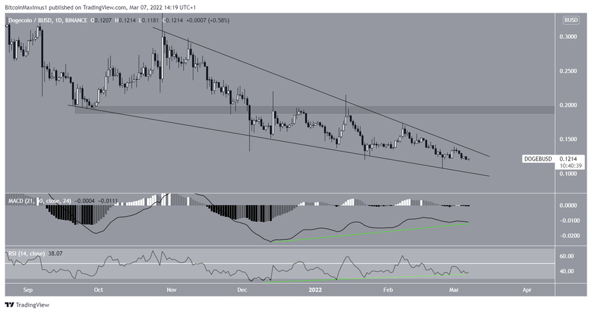 Z jednej strony, zarówno RSI jak i MACD wygenerowały bardzo znaczące bycze dywergencje. Jest to znak, który często poprzedza bycze odwrócenie trendu. Jest on bardziej uzasadniony faktem, że DOGE znajduje się wewnątrz byczej formacji.