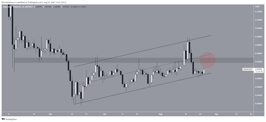 Ponadto Dogecoin handluje w dolnej części wznoszącego się kanału równoległego, w którym zazwyczaj występują ruchy korekcyjne. Nakreślony wcześniej obszar oporu 0,075 USD zbiega się ze środkiem kanału, zwiększając jego siłę.