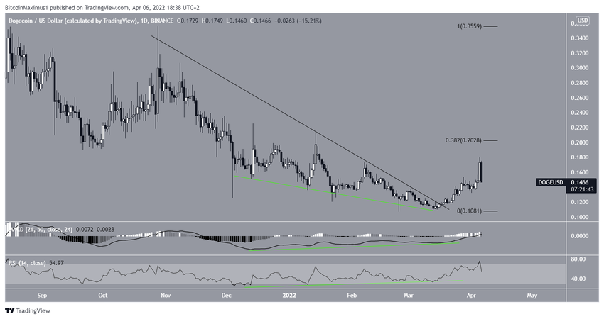 Od tego czasu Dogecoin wzrasta, ale nadal notowany jest poniżej wspomnianego obszaru 0,165 USD, który ma teraz pełnić rolę oporu. Obecnie cena znajduje się 80% poniżej ATH.