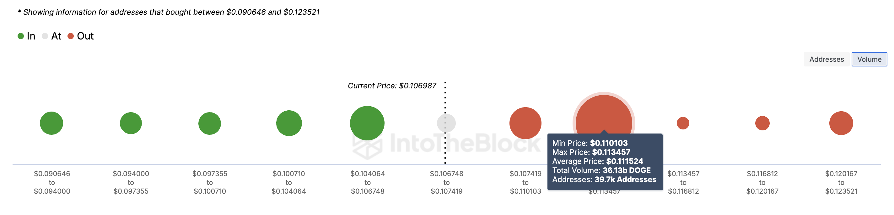 Wskaźnik In/Out of Money Around Price (IOMAP) pokazuje, że najbardziej znaczące wsparcie dla DOGE leży w okolicach 0,11 USD. Na tym poziomie cenowym 39 700 adresów zakupiło 36,13 miliarda DOGE i trzyma monetę ze stratą.