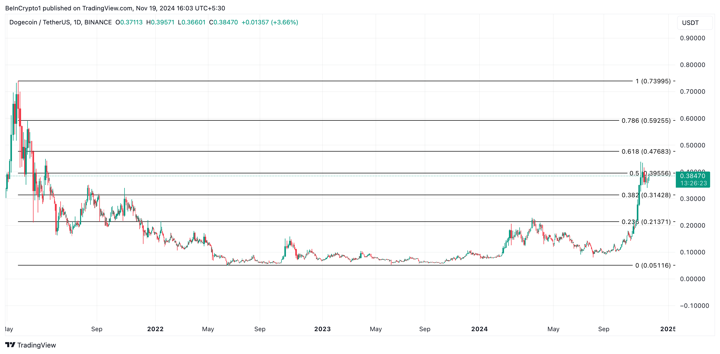 Dogecoin nie tak dawno osiągnął najwyższy szczyt od trzech lat na poziomie 0,43 USD, 12 listopada. Niedługo po tym spadł do 0,38 USD, utrzymując wzrost o 3% dziennie. Wydaje się, że cena Dogecoin (DOGE) zatrzymała się i nie wzrasta, a to za sprawą realizacji zysków przez posiadaczy długoterminowych.