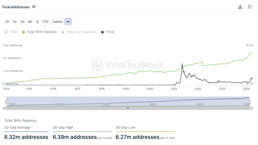 Od początku roku sieć Dogecoin wykazuje silny wzrost. W ciągu ostatnich 30 dni zarejestrowano średnio 6,3 mln adresów DOGE, z których każdy posiadał dodatnie saldo.