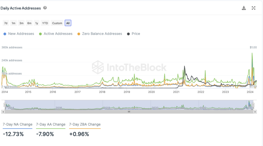 Z drugiej strony, aktywność sieci Dogecoin doświadczyła niewielkiego spadku. W ciągu ostatnich siedmiu dni nastąpił spadek o około 12,73% w tworzeniu nowych adresów. Łączy się to z prawie 8% spadkiem odsetka aktywnych adresów.