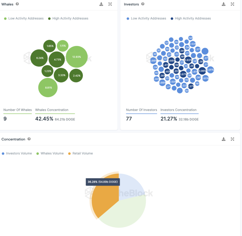 W sferze Dogecoin, kilku wybranych głównych inwestorów posiada znaczną część własności tokenów. Około 77 podmiotów posiada udziały w wysokości od 0,1% do 1% całkowitej liczby tokenów, co łącznie stanowi około 21,3% całkowitej podaży.