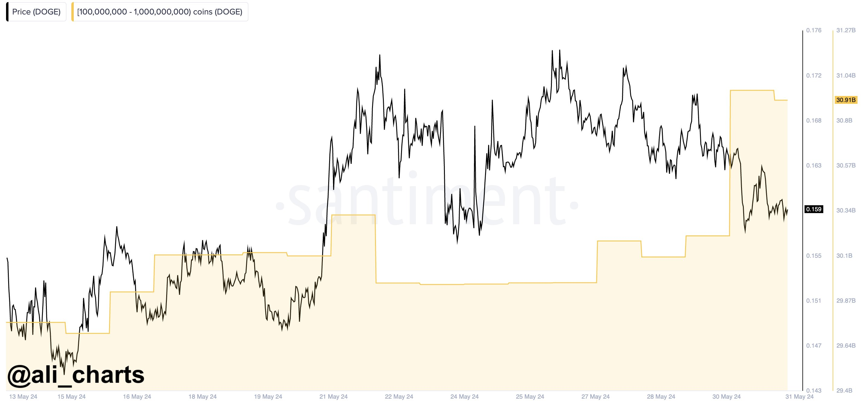 Ali Martinez, inny analityk kryptowalut, w swoim poście na X z 31 maja zauważył, że w ciągu ostatnich kilku dni wieloryby nabyły ponad 700 mln DOGE, co odpowiada kwocie około 112 mln USD.