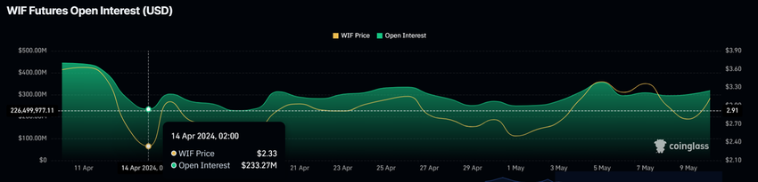 Cena WIF może kontynuować trend wzrost ze względu na sygnały odnotowane w zachowaniu inwestorów. Otwarte pozycje (open interenst) są argumentem za tym trendem. Otwarte pozycje reprezentują całkowitą liczbę nierozliczonych kontraktów futures. Odzwierciedla to poziom zainteresowania inwestorów i potencjalną zmienność rynku.
