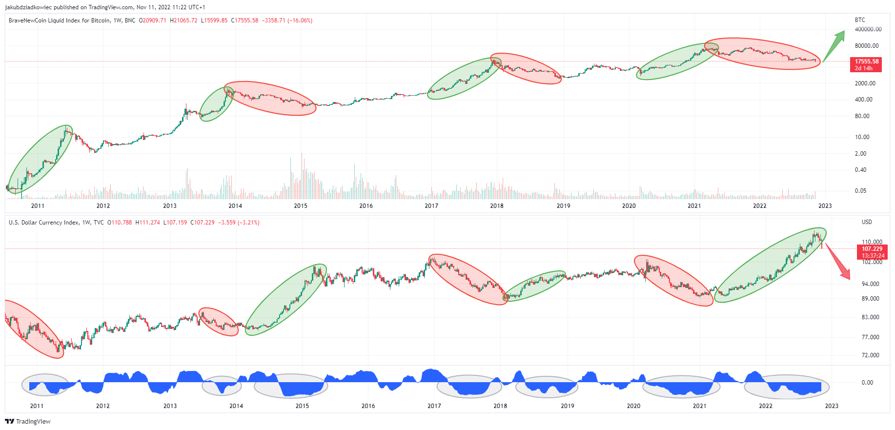 Jeżeli dolar amerykański istotnie osiągnął szczyt obecnego cyklu, to jest możliwe, że Bitcoin jest blisko wygenerowania – lub już to zrobił na poziomie 15 588 USD – makro dołka. Jeżeli jednak DXY się odbije i wznowi wzrosty po korekcie, to rynek kryptowalut – nękany własnymi problemami w związku z załamaniem FTX – oraz BTC mogą czekać znacznie niższe ceny.