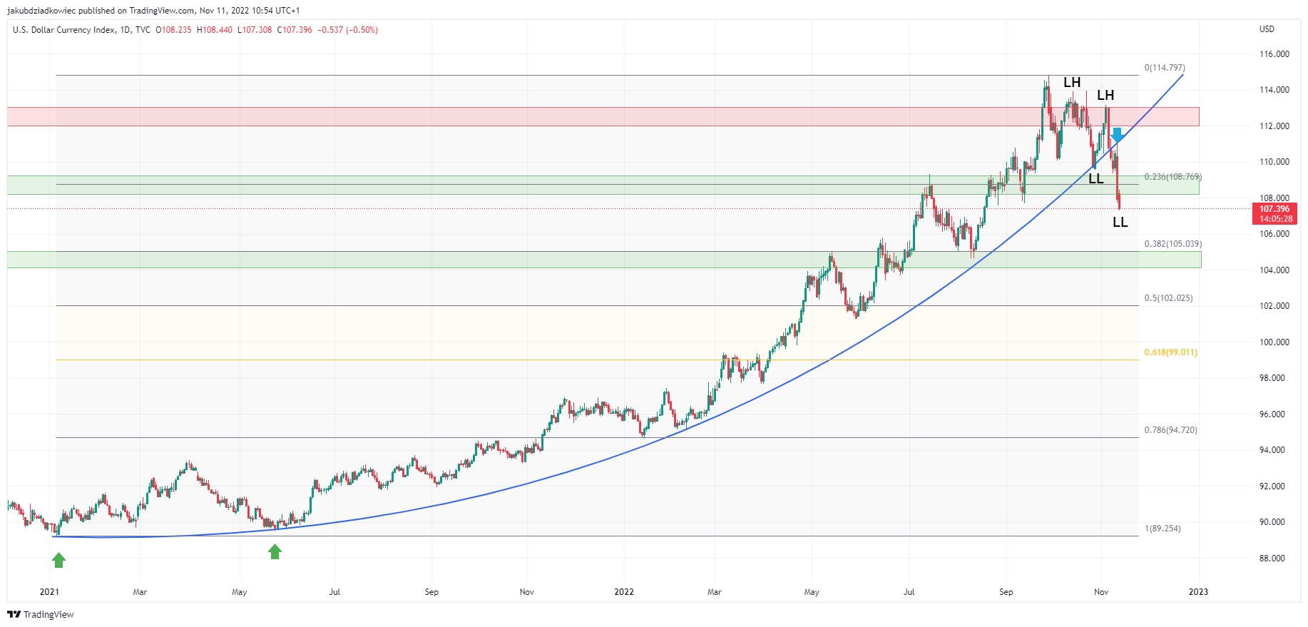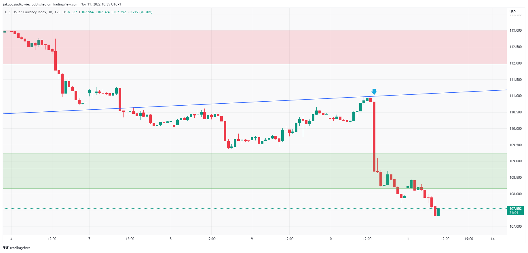 Tuż po ogłoszeniu danych o inflacji w USA za październik dolar amerykański odnotował gwałtowny spadek. DXY utracił prawie 2% w ciągu godziny (niebieska strzałka), spadając do obszaru wsparcia w zakresie 108-109 (zielony). W kolejnych godzinach obszar ten nie został utrzymany i dolar amerykański kontynuuje dziś spadki z aktualnym dołkiem na 107,3. Jest to poziom nie widzianym od sierpnia 2022 roku.