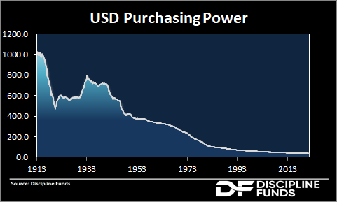 “Ludzie oferują dziś znacznie mniej rzeczy za dolara amerykańskiego. Od 1933 roku dolar amerykański stracił 92 procent swojej krajowej siły nabywczej. Nawet przy “średniej” stopie inflacji wynoszącej 2,7 procent rocznie, którą obserwujemy od 1994 roku”.