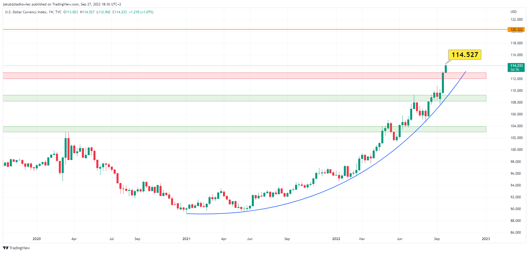 Dziś DXY odnotował szczyt na 114,5 i nie widać, aby zamierzał na tym poprzestać. Tym samym pokonuje zakres historycznego oporu na 112-113 (czerwony prostokąt). Kolejny potencjalny makro opór znajduje się dopiero na poziomie 120 (pomarańczowa linia).